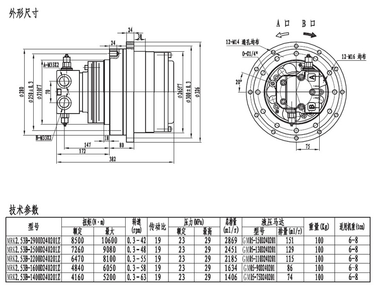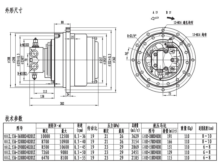 MRK2.53系列履帶(車輪)用的行走減速機(jī)輸出扭矩在10000左右,采用兩級(jí)速比的減速器帶動(dòng),最低輸出轉(zhuǎn)速0.3r/min.
