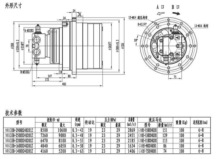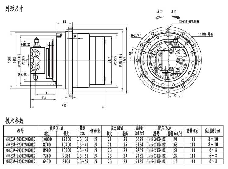 MRK2.53系列履帶(車輪)用的行走減速機(jī)輸出扭矩在10000左右,采用兩級(jí)速比的減速器帶動(dòng),最低輸出轉(zhuǎn)速0.3r/min.